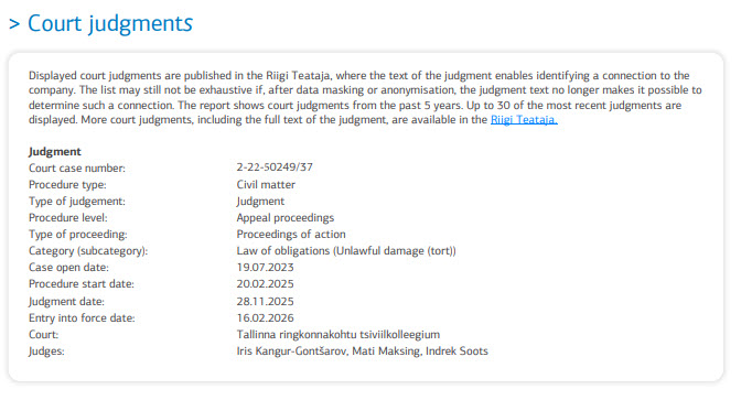 В отчетах отображаются судебные решения, опубликованные в Riigi Teataja, в тексте которых можно установить связь с соответствующей компанией или лицом. Информация основана на содержательном анализе текстов решений и выделяет случаи, в которых компания или лицо упоминаются в контексте судебного разбирательства. В отчете предоставлена прямая ссылка на результаты поиска судебных решений в Riigi Teataja по соответствующей компании или лицу для просмотра полного текста решения.